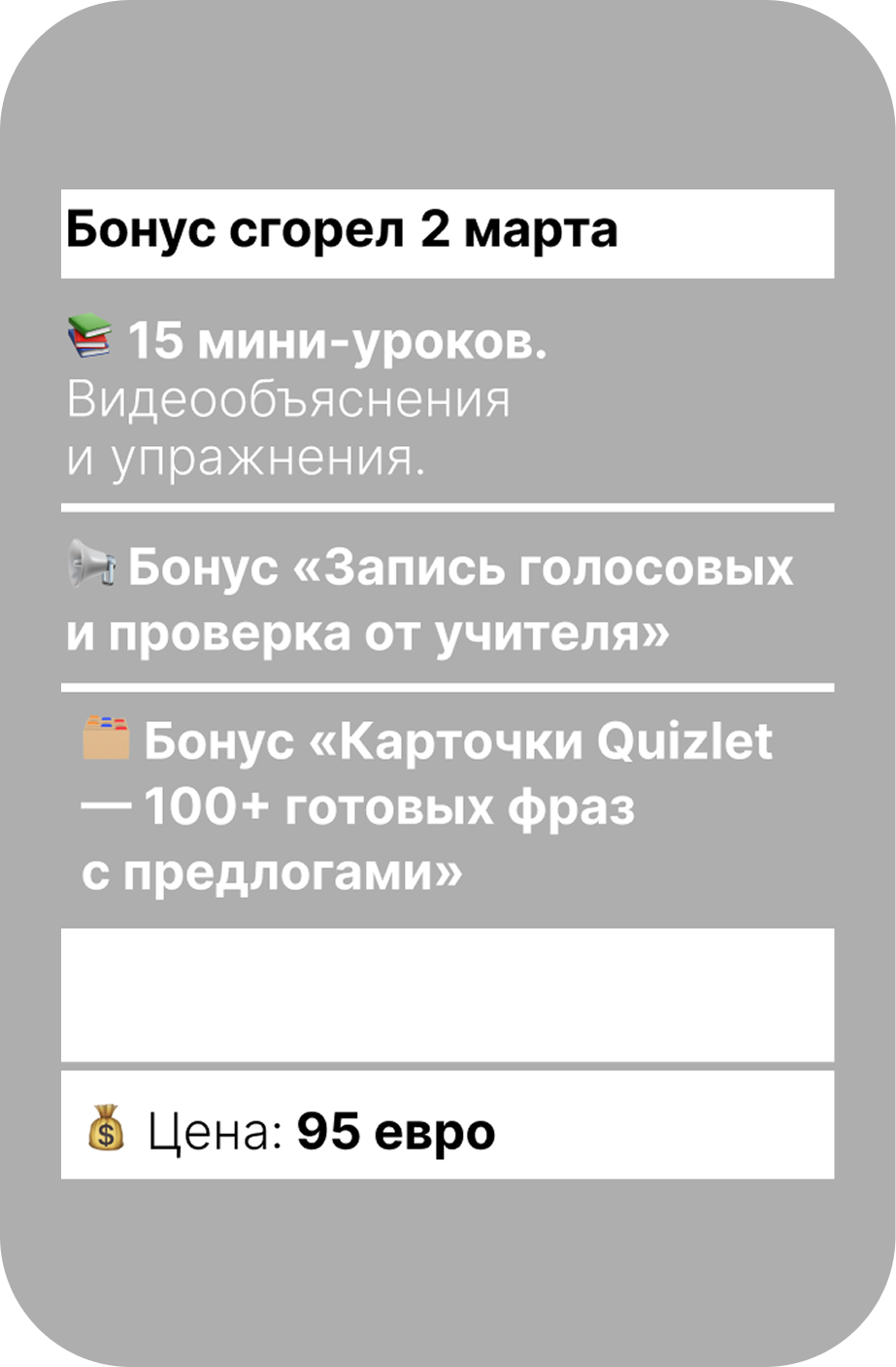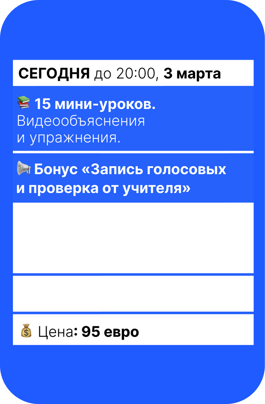 ✅ Мы запоминаем готовыми фразами, которые можно сразу использовать в жизни и тренируем говорение в форме голосовых сообщений: вы записываете, преподаватель проверяет.